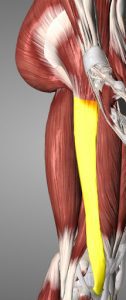 The Iliotibial Band (IT Band) is a thick band of connective tissue that comes from the Tensor Fascia Latae (TFL) and Gluteus Maximus muscles. It originates from the anterior iliac crest of the pelvis and attaches on the lateral aspect of the knee at the lateral epicondyle. As it travels along the outside of the thigh it crosses both the hip and knee joints.