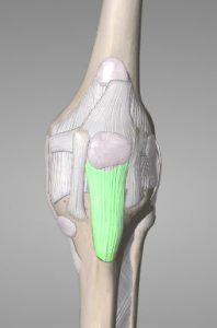 The Patellar Tendon is located just below the kneecap (patella). It attaches from the bottom of the patella to the top of the shin bone and its major function is to transmit the force of the quadriceps over the knee joint.