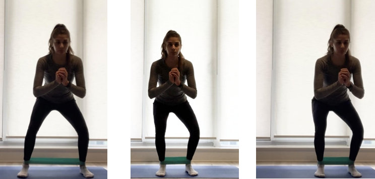 Wrap a band just above the ankles. Standing with your feet slightly apart and your hips and knees in a bent position, push your knees outward into the band.