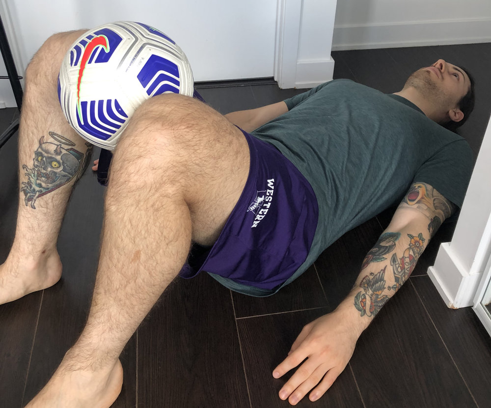 All you need for this exercise is a ball or some object that is soft enough to comfortably squeeze with your knees, but it should be firm enough that it will give you resistance and not just collapse. Lay on your back with both knees bent and your feet on the ground. Place the ball between your knees and squeeze the ball together with both legs. This is an easy-to-adjust exercise, because you can determine how hard you squeeze the ball. If your muscles get too tired or become too sore, squeeze with less intensity. If you barely feel your muscles working, you can attempt to squeeze the ball harder between your legs. Hold each repetition for a full 5 seconds and then relax. Aim to complete this exercise for 5 repetitions of 5-second holds, for 3-5 sets.
