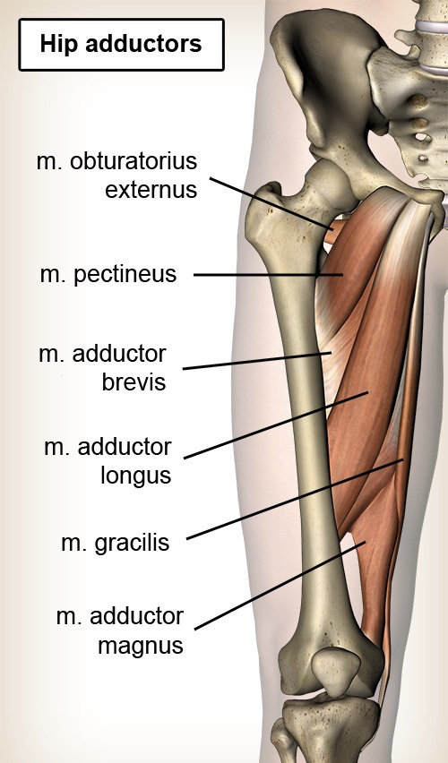 Groin strains are a dreaded but unfortunately common injury that occur during activity or sport. When discussing the groin muscles, we are really referring to the hip adductor group of muscles. The muscles that adduct the hip (bring your thighs towards each other) include: adductor brevis, adductor longus, adductor magnus, gracilis, pectineus, and obturator externus. To keep things simple, we are going to refer to this collective group of muscles as “the adductors.” The adductor muscles all attach relatively close to the middle of the pelvis and run down to various points along the inner thigh (the exception being gracilis which attaches below the knee).